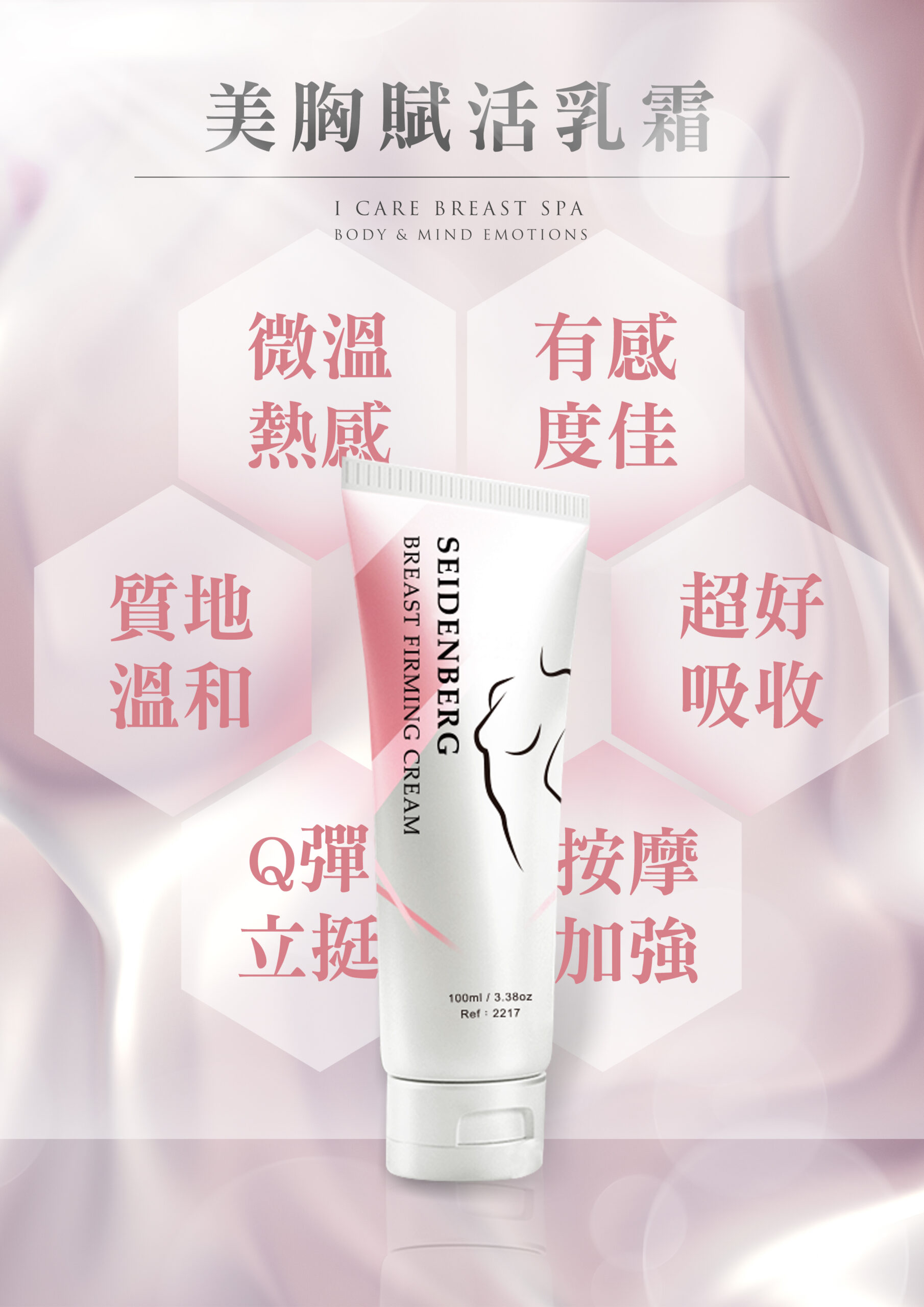 滋養肌膚,恢復肌膚彈性,美化胸部肌膚 取適量按摩胸部肌膚至完全吸收即可,不用清洗